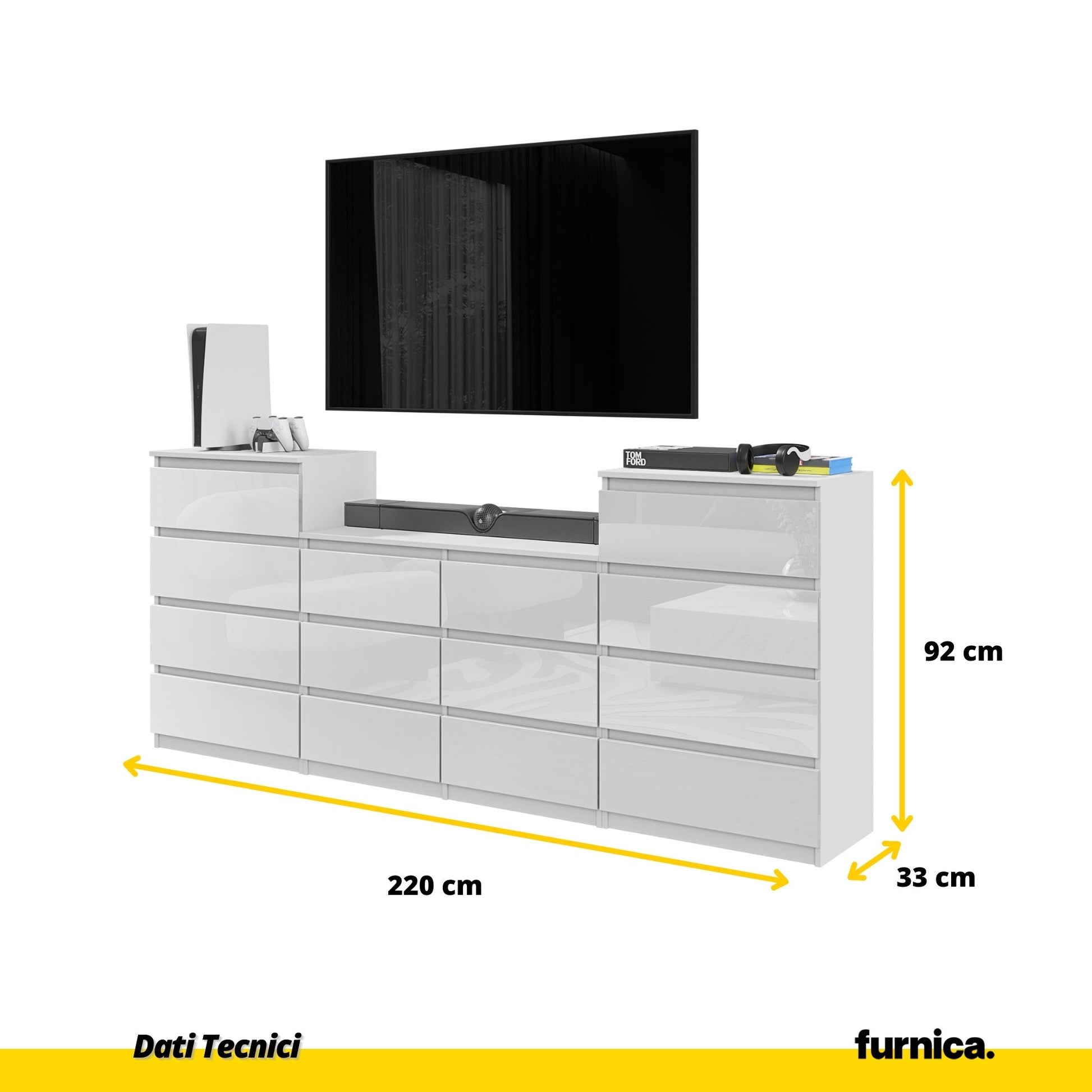 La cassettiera GABRIEL rappresenta la soluzione definitiva per chi cerca un equilibrio perfetto tra estetica contemporanea e massima capacità contenitiva. Con una larghezza imponente di 220 cm, questo complemento d'arredo diventa il fulcro visivo della zona notte o del living, donando prestigio e luminosità grazie alla raffinata finitura in bianco lucido. La superficie riflettente amplifica la percezione degli spazi, mentre la profondità contenuta di soli 33,5 cm rende questo mobile una scelta d'arredo salvaspazio ideale per ottimizzare pareti ampie senza ostacolare il passaggio. La maestosità del design si fonde con una funzionalità estrema, trasformando una semplice cassettiera in un elemento architettonico che definisce il carattere della tua casa.